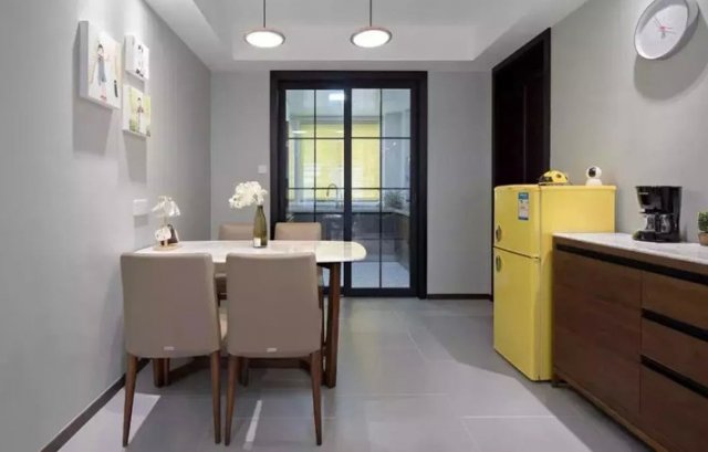 如果餐厅也小的话,推荐可以放在北阳台位置,大家都知道南阳台的采光是很好的,而北阳台的环境阴凉,适合电器散热,也不会晒坏电器。
