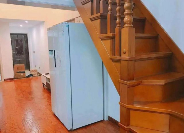 对于复式户型,特别是小复式,通常会有楼梯,在楼梯下方放个冰箱什么的不在话下,而且这个位置也不会占用家里空间。